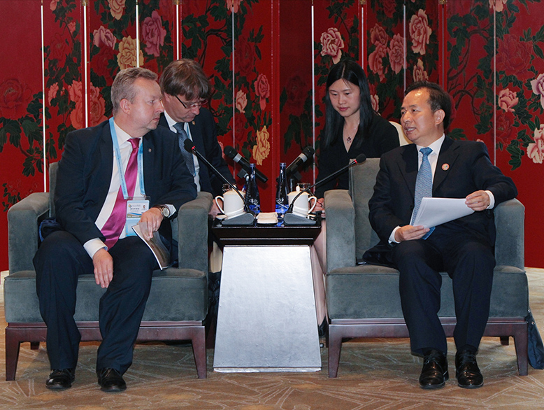 李干杰首先代表生態環境部對布拉貝茨來華出席第二屆“一帶一路”國際合作高峰論壇和綠色之路分論壇表示歡迎,并簡要介紹了中國生態環境保護工作進展。他說,近年來,中國政府把生態環境保護擺在全局工作的突出地位,一方面立足國內實際,采取一系列政策措施,將生態環境保護融入經濟社會發展各個方面,推動綠色發展取得積極成效;另一方面不斷加強國際合作,推動全球生態環境治理,與國際社會共謀全球生態文明建設。