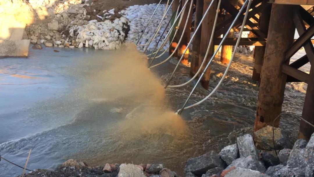 治污藥劑由噴頭噴出,均勻灑向河面。