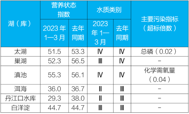 1—3月,監測的195個重點湖(庫)中,水質優良(Ⅰ—Ⅲ類)湖庫個數占比81.0%,同比上升2.9個百分點;劣Ⅴ類水質湖庫個數占比4.6%,同比下降0.1個百分點。主要污染指標為總磷、化學需氧量和高錳酸鹽指數。186個監測營養狀態的湖(庫)中,中度富營養的4個,占2.2%;輕度富營養的34個,占18.3%;其余湖(庫)為中營養或貧營養狀態。其中,太湖為輕度污染、輕度富營養,主要污染指標為總磷;巢湖水質良好、輕度富營養;滇池為輕度污染、輕度富營養,主要污染指標為化學需氧量;洱海水質為優、中營養;丹江口水庫水質為優、貧營養;白洋淀水質良好、中營養。