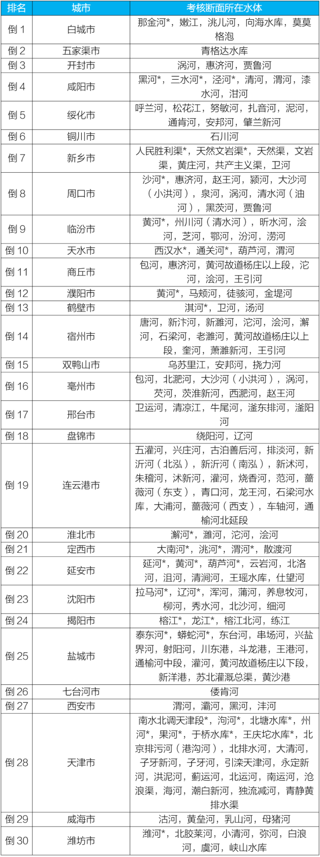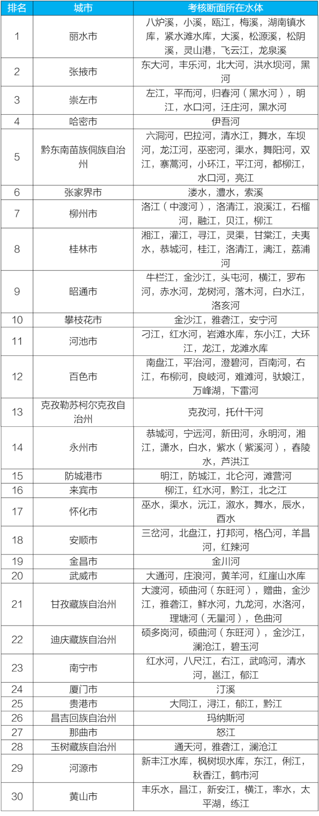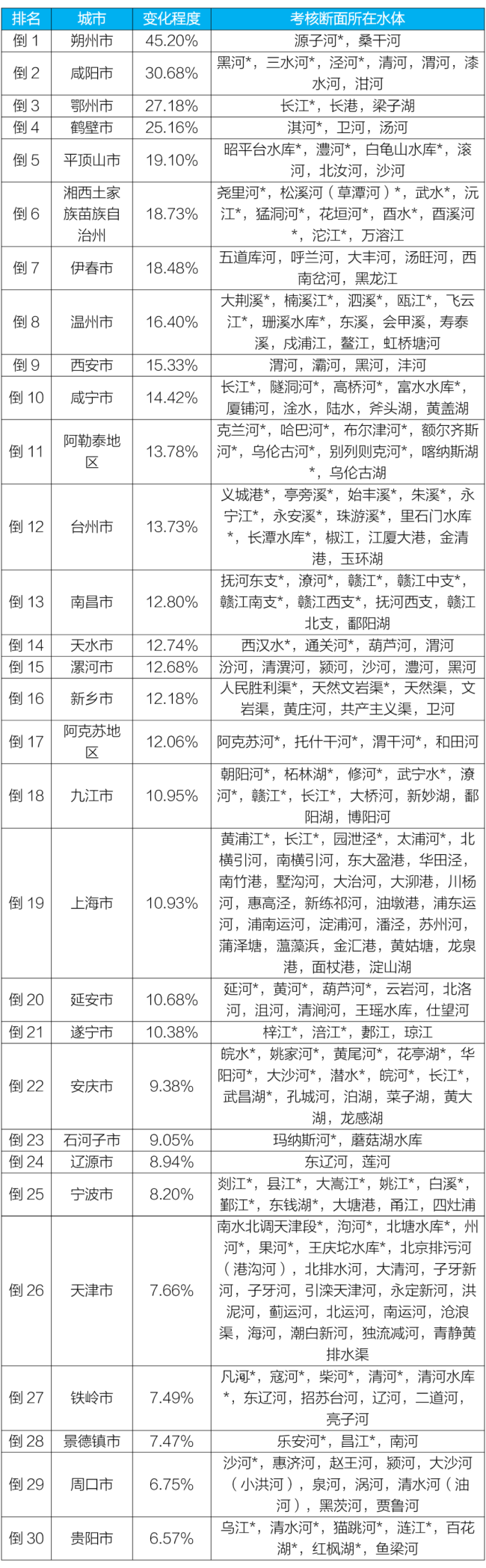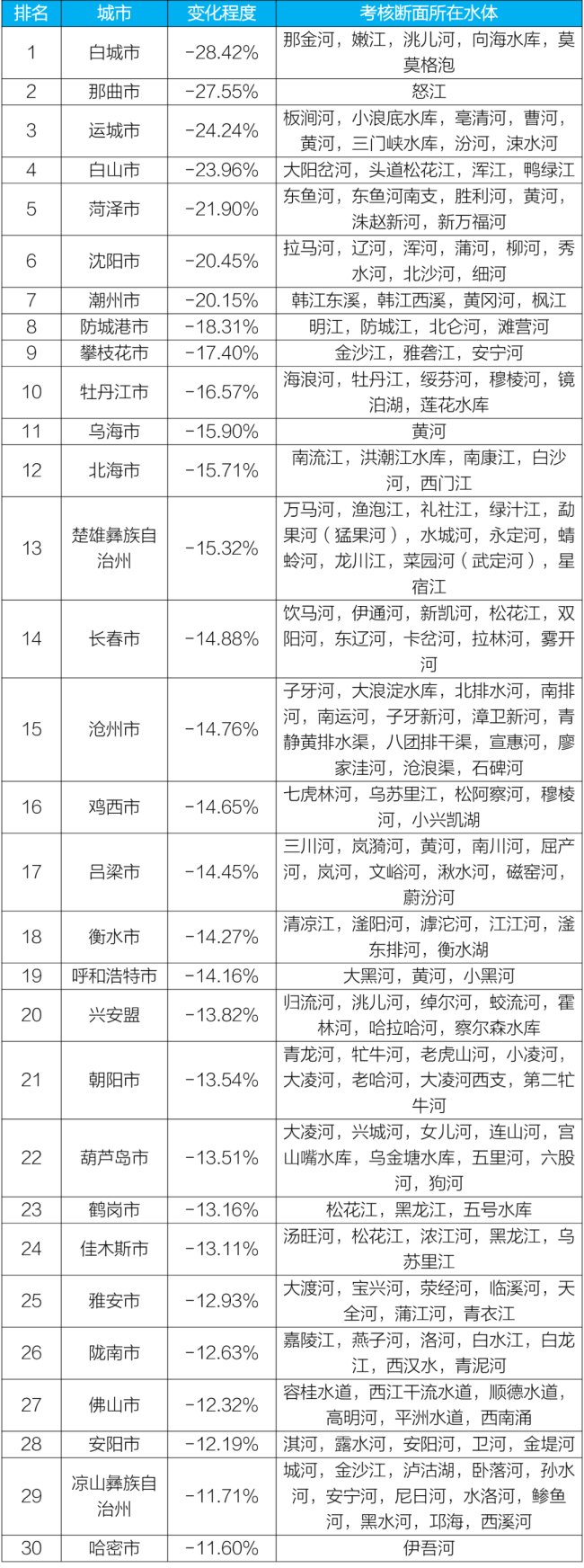 白城、那曲和運城等30個城市國家地表水考核斷面水環境質量變化情況相對較好(從第1名至第30名),朔州、咸陽和鄂州等30個城市國家地表水考核斷面水環境質量變化情況相對較差(從倒數第1名至倒數第30名)。見附表3—附表4。