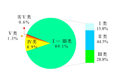 1—3月,全國地表水水質優良(Ⅰ—Ⅲ類)斷面比例為89.1%,同比上升0.9個百分點;劣Ⅴ類斷面比例為0.6%,同比下降0.4個百分點。主要污染指標為化學需氧量、總磷和高錳酸鹽指數。