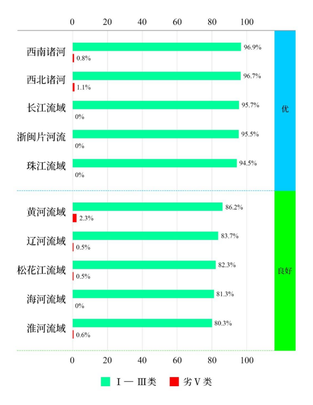 1—3月,長江、黃河、珠江、松花江、淮河、海河、遼河等七大流域及西南諸河、西北諸河和浙閩片河流水質優良(Ⅰ—Ⅲ類)斷面比例為90.3%,同比上升0.6個百分點;劣Ⅴ類斷面比例為0.4%,同比下降0.4個百分點。主要污染指標為化學需氧量、五日生化需氧量和氨氮。其中,西南諸河、西北諸河、長江流域、浙閩片河流和珠江流域水質為優;黃河、遼河、松花江、海河和淮河流域水質良好。