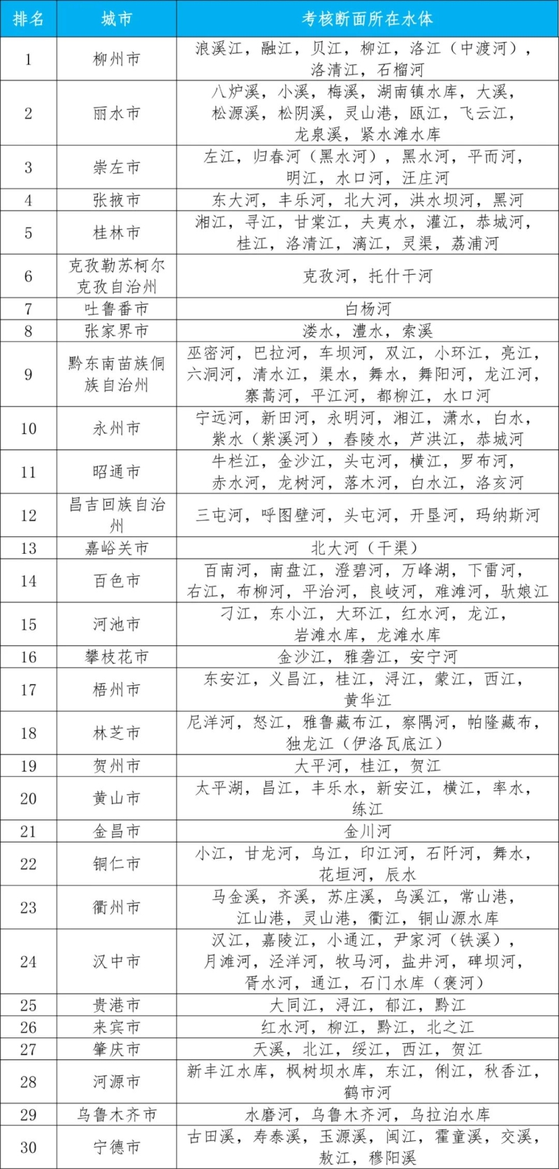 1—12月,全國地級及以上城市中,柳州市、麗水市和崇左市等30個城市國家地表水考核斷面水環境質量相對較好(從第1名至第30名),五家渠市、商丘市和開封市等30個城市國家地表水考核斷面水環境質量相對較差(從倒數第1名至倒數第30名),見附表1—2。