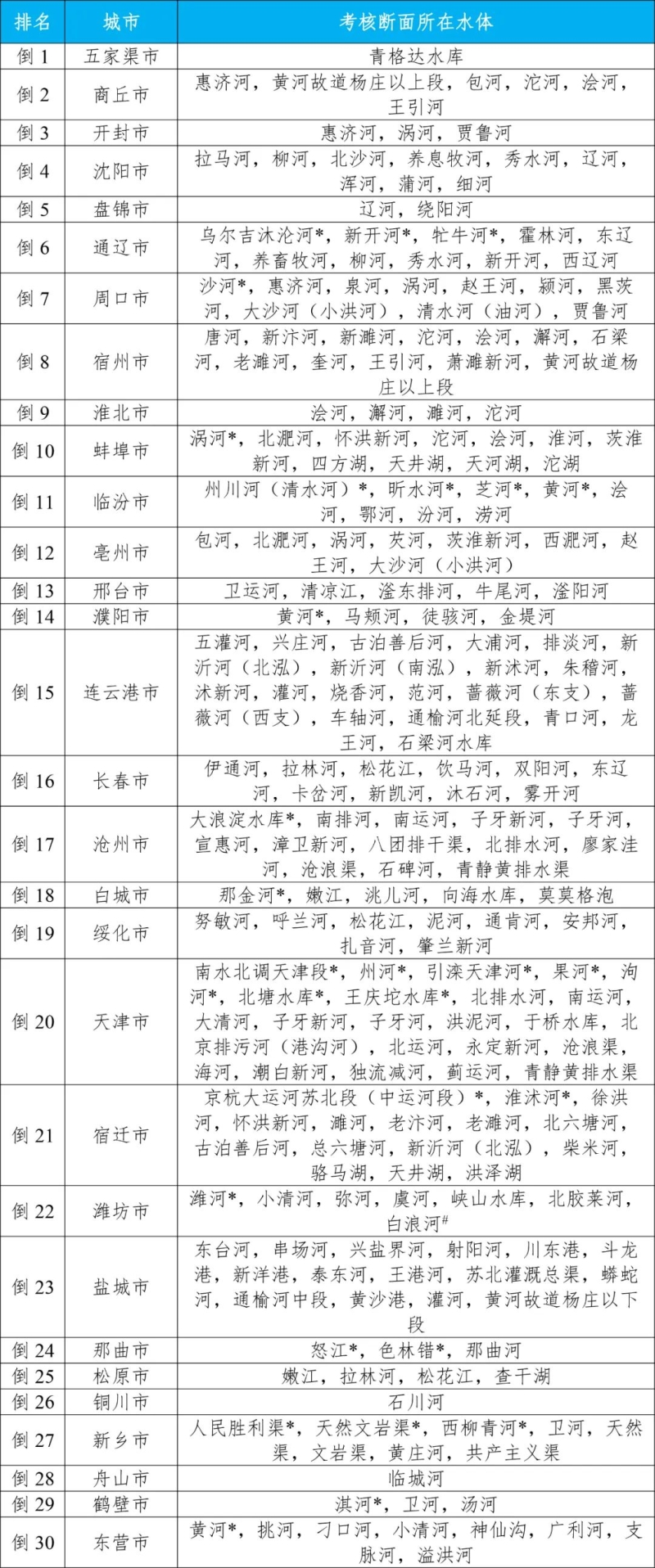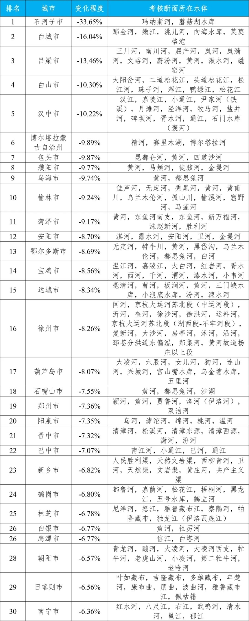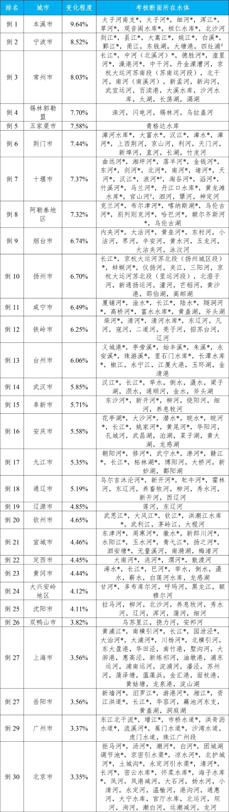 石河子市、白城市和呂梁市等30個城市國家地表水考核斷面水環境質量變化情況相對較好(從第1名至第30名),本溪市、寧波市和常州市等30個城市國家地表水考核斷面水環境質量變化情況相對較差(從倒數第1名至倒數第30名)。見附表3—4。