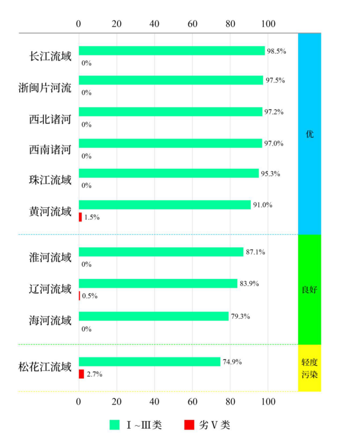 1—12月,長江、黃河、珠江、松花江、淮河、海河、遼河等七大流域及西北諸河、西南諸河和浙閩片河流水質優良(Ⅰ—Ⅲ類)斷面比例為91.7%,同比上升1.5個百分點;劣Ⅴ類斷面比例為0.4%,同比持平。主要污染指標為化學需氧量、高錳酸鹽指數和五日生化需氧量。其中,長江流域、浙閩片河流、西北諸河、西南諸河、珠江和黃河流域水質為優;淮河、遼河和海河流域水質良好;松花江流域為輕度污染。