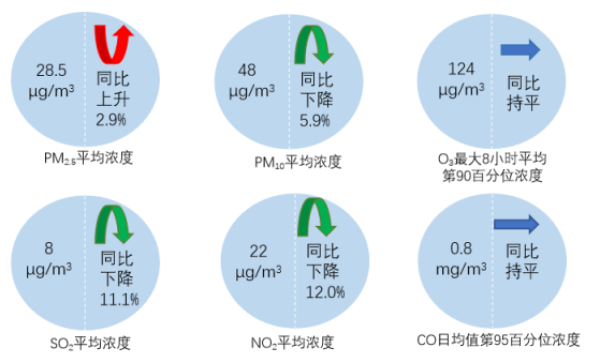 10月,全國(guó)339個(gè)地級(jí)及以上城市PM2.5平均濃度為28.5微克/立方米,同比上升2.9%;PM10平均濃度為48微克/立方米,同比下降5.9%;O3平均濃度為124微克/立方米,同比持平;SO2平均濃度為8微克/立方米,同比下降11.1%;NO2平均濃度為22微克/立方米,同比下降12.0%;CO平均濃度為0.8毫克/立方米,同比持平。