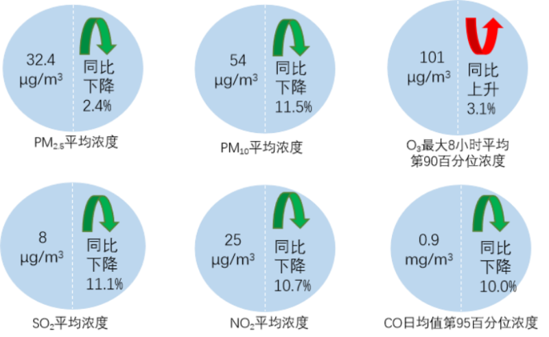 11月,全國339個地級及以上城市PM2.5平均濃度為32.4微克/立方米,同比下降2.4%;PM10平均濃度為54微克/立方米,同比下降11.5%;O3平均濃度為101微克/立方米,同比上升3.1%;SO2平均濃度為8微克/立方米,同比下降11.1%;NO2平均濃度為25微克/立方米,同比下降10.7%;CO平均濃度為0.9毫克/立方米,同比下降10.0%。