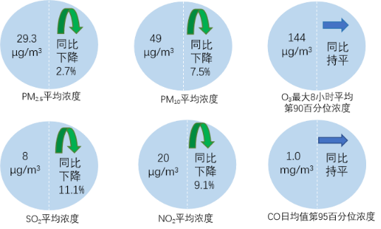 1—12月,全國339個地級及以上城市PM2.5平均濃度為29.3微克/立方米,同比下降2.7%;PM10平均濃度為49微克/立方米,同比下降7.5%;O3平均濃度為144微克/立方米,同比持平;SO2平均濃度為8微克/立方米,同比下降11.1%;NO2平均濃度為20微克/立方米,同比下降9.1%;CO平均濃度為1.0毫克/立方米,同比持平。