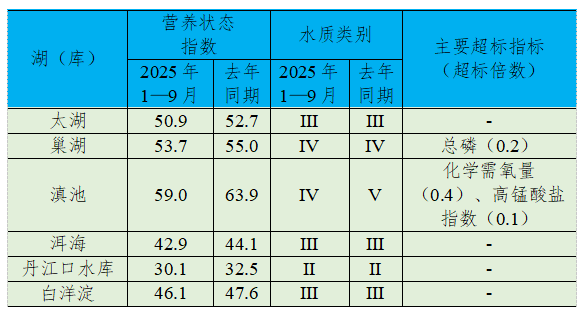 第三季度,監測的209個重點湖(庫)中,水質優良(Ⅰ—Ⅲ類)湖庫個數占比73.7%,同比上升6.4個百分點;劣Ⅴ類水質湖庫個數占比4.8%,同比上升0.5個百分點。主要超標指標為總磷、化學需氧量和高錳酸鹽指數。201個監測營養狀態的湖(庫)中,中度富營養的10個,占5.0%;輕度富營養的59個,占29.4%;其余湖(庫)為中營養或貧營養狀態。其中,太湖水質良好、輕度富營養;巢湖為輕度污染、輕度富營養,主要超標指標為總磷;滇池為中度污染、中度富營養,主要超標指標為化學需氧量、高錳酸鹽指數和總磷;洱海水質良好、中營養;丹江口水庫水質為優、貧營養;白洋淀為輕度污染、中營養,主要超標指標為溶解氧。