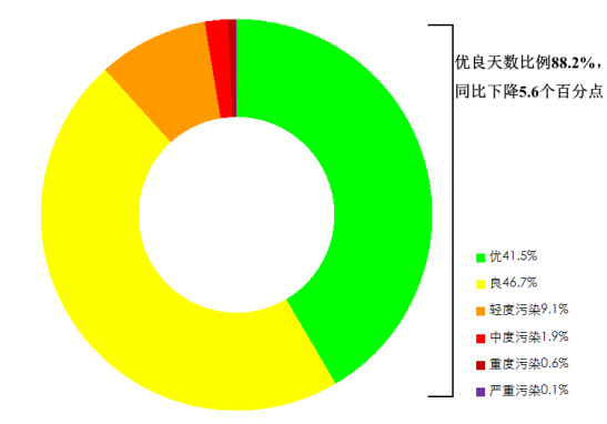 11月,全國339個(gè)地級(jí)及以上城市平均空氣質(zhì)量優(yōu)良天數(shù)比例為88.2%,同比下降5.6個(gè)百分點(diǎn);平均重度及以上污染天數(shù)比例為0.7%,同比上升0.4個(gè)百分點(diǎn)。由沙塵天氣導(dǎo)致的平均超標(biāo)天數(shù)比例為5.3%,其中重度及以上污染天數(shù)比例為0.3%。