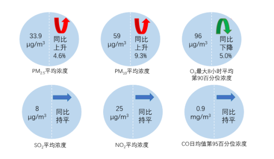 11月,全國339個(gè)地級(jí)及以上城市PM2.5平均濃度為33.9微克/立方米,同比上升4.6%;PM10平均濃度為59微克/立方米,同比上升9.3%;O3平均濃度為96微克/立方米,同比下降5.0%;SO2平均濃度為8微克/立方米,同比持平;NO2平均濃度為25微克/立方米,同比持平;CO平均濃度為0.9毫克/立方米,同比持平。