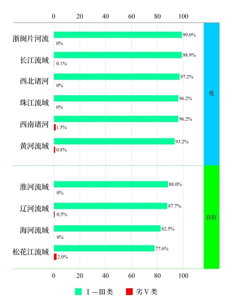 1—12月,長江、黃河、珠江、松花江、淮河、海河、遼河等七大流域及西北諸河、西南諸河和浙閩片河流水質優良(Ⅰ—Ⅲ類)斷面比例為93.0%,同比上升0.6個百分點;劣Ⅴ類斷面比例為0.4%,同比上升0.1個百分點。主要超標指標為化學需氧量、高錳酸鹽指數和五日生化需氧量。其中,浙閩片河流、長江流域、西北諸河、珠江流域、西南諸河和黃河流域水質為優;淮河、遼河、海河和松花江流域水質良好。