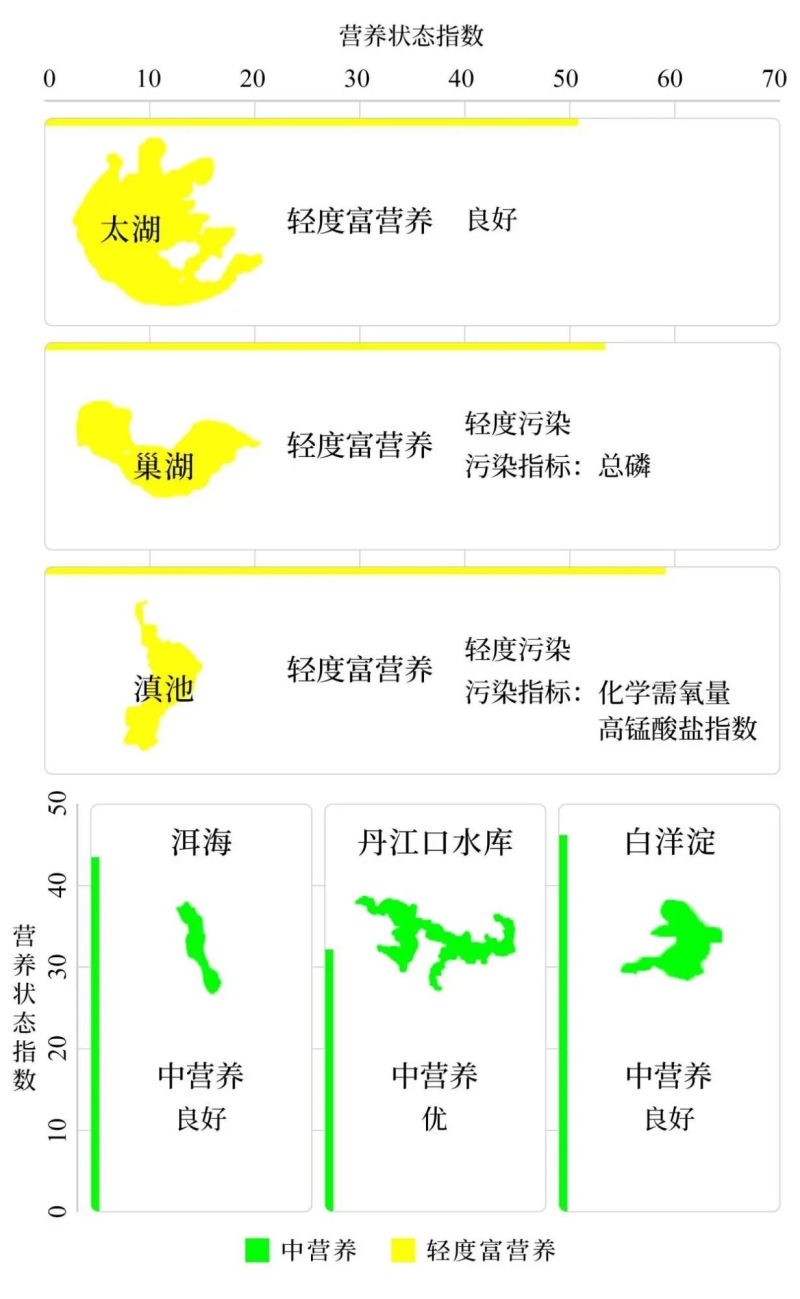 第四季度,監測的208個重點湖(庫)中,水質優良(Ⅰ—Ⅲ類)湖庫個數占比76.9%,同比上升5.1個百分點;劣Ⅴ類水質湖庫個數占比2.9%,同比下降1.4個百分點。主要超標指標為總磷、化學需氧量和高錳酸鹽指數。202個監測營養狀態的湖(庫)中,中度富營養的4個,占2.0%;輕度富營養的51個,占25.2%;其余湖(庫)為中營養或貧營養狀態。其中,太湖水質良好、輕度富營養;巢湖為輕度污染、輕度富營養,主要超標指標為總磷;滇池為輕度污染、輕度富營養,主要超標指標為化學需氧量;洱海、丹江口水庫和白洋淀水質良好、中營養。