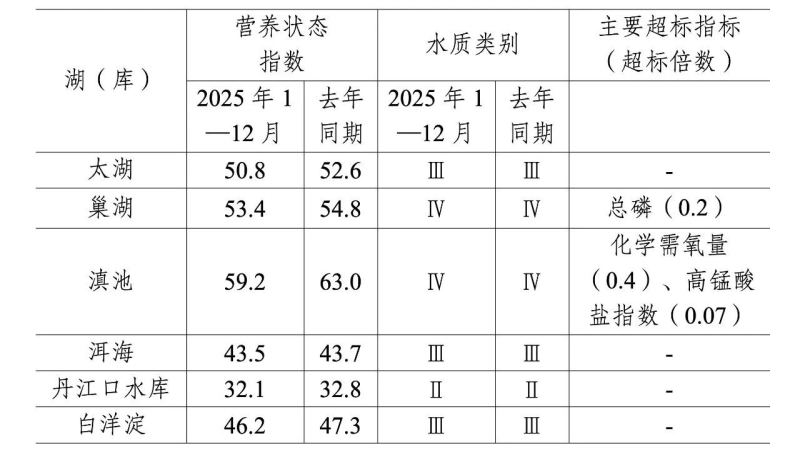 1—12月,監測的209個重點湖(庫)中,水質優良(Ⅰ—Ⅲ類)湖庫個數占比78.5%,同比上升1.4個百分點;劣Ⅴ類水質湖庫個數占比3.3%,同比下降1.0個百分點。主要超標指標為總磷、化學需氧量和高錳酸鹽指數。204個監測營養狀態的湖(庫)中,中度富營養的3個,占1.5%;輕度富營養的55個,占27.0%;其余湖(庫)為中營養或貧營養狀態。其中,太湖水質良好、輕度富營養;巢湖為輕度污染、輕度富營養,主要超標指標為總磷;滇池為輕度污染、輕度富營養,主要超標指標為化學需氧量和高錳酸鹽指數;洱海和白洋淀水質良好、中營養;丹江口水庫水質為優、中營養。
