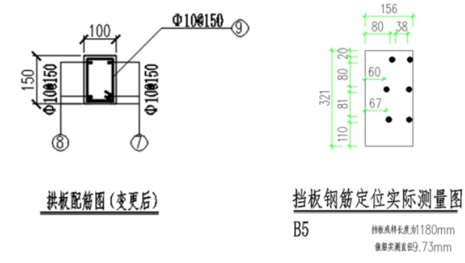 圖2 4#排水井拱板實(shí)際配筋與設(shè)計(jì)配筋圖