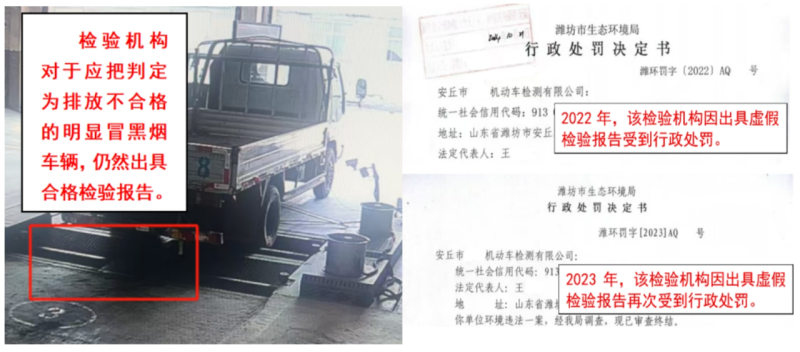 經濰坊市生態環境局核實,2022年9月該機構曾因對冒黑煙車出具合格檢驗報告,被濰坊市生態環境局安丘分局實施行政處罰。2023年5月,濰坊市生態環境局安丘分局在接到群眾舉報后進行核查,發現該機構仍在實施對冒黑煙車出具合格檢驗報告的違法行為,故對該機構再次作出行政處罰。