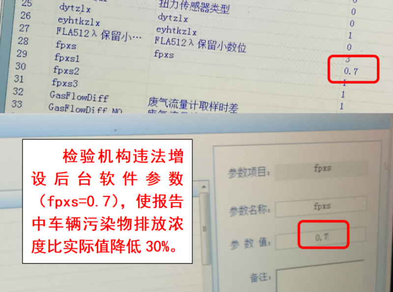 安徽省馬鞍山市生態環境局、江蘇省南京市生態環境局在開展跨區域聯合執法行動時,通過大數據排查發現,部分在南京市首檢不合格車輛,均在馬鞍山市某機動車輛檢測有限公司重新上線通過檢驗。隨后,馬鞍山市生態環境局聯合市公安局開展突擊檢查,發現該機構串通檢測軟件開發公司,在后臺違法設置修正參數(fpxs),通過調整修正參數數值,人為降低各項污染物排放濃度,使排放不合格車輛通過檢測。
