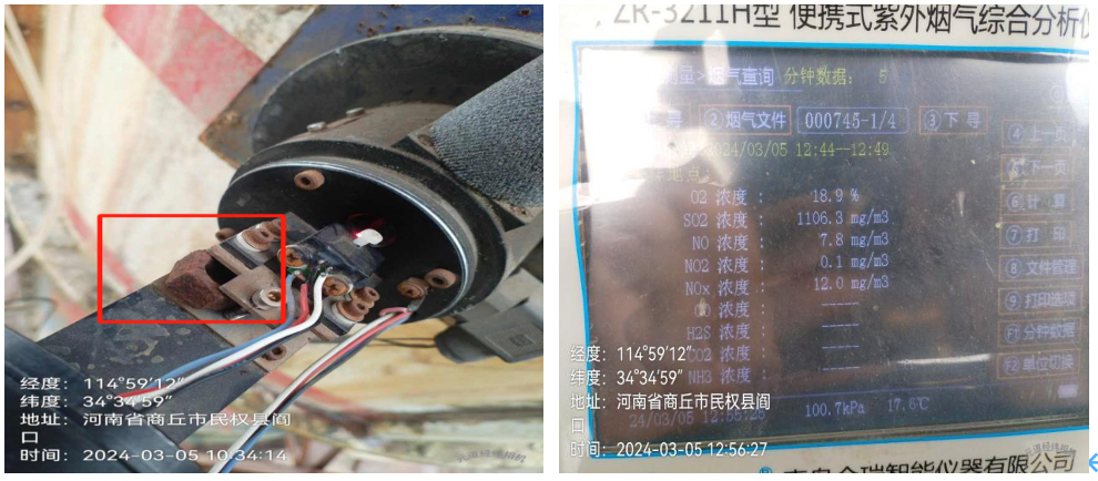 粉塵檢測儀激光發射器被人為用螺母墊高;監測結果顯示二氧化硫濃度1106.3mg/m3,折算后濃度為1580.42mg/m3